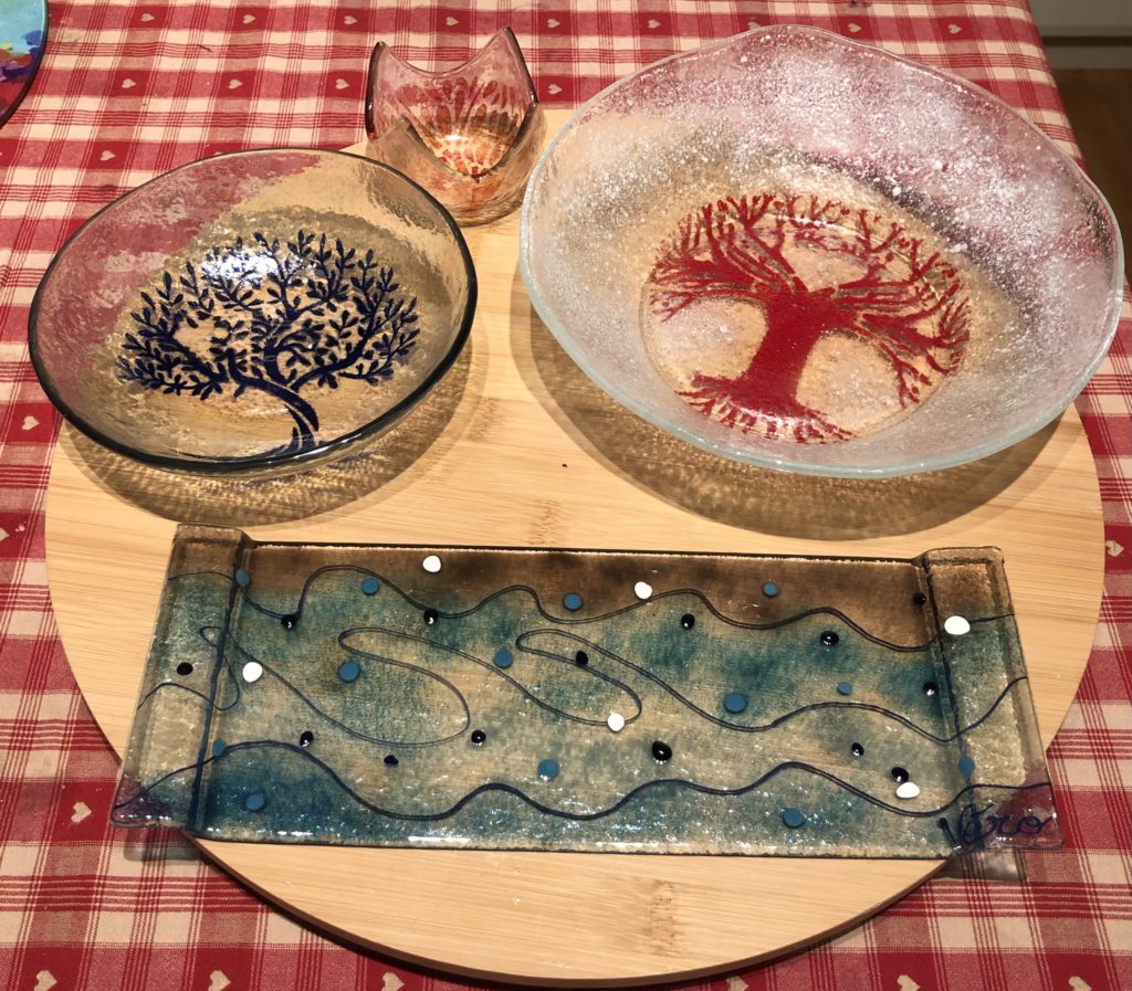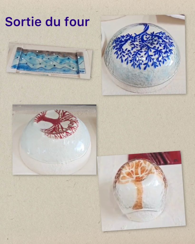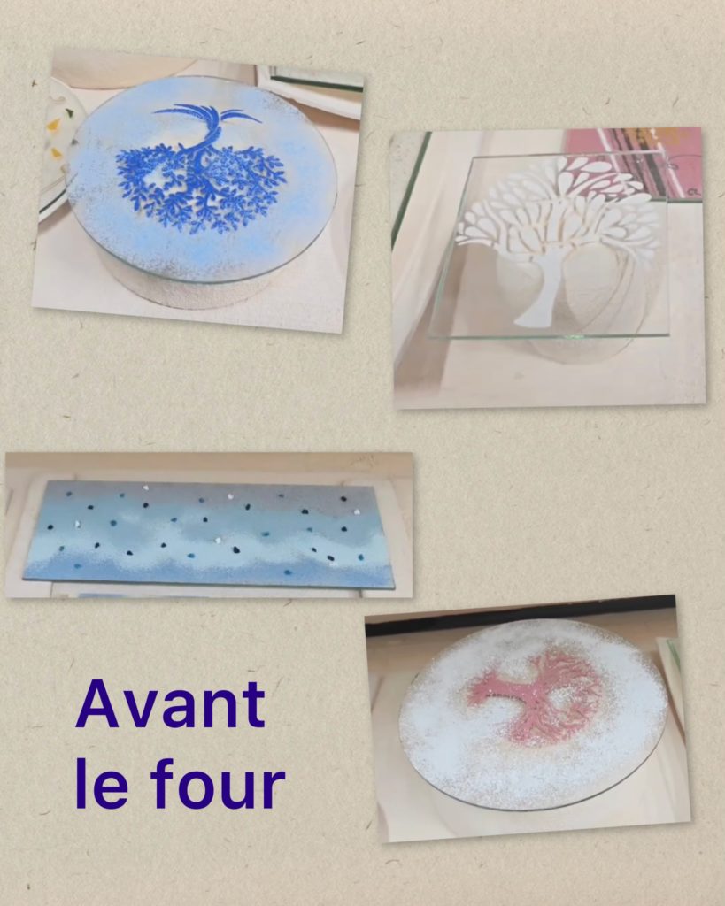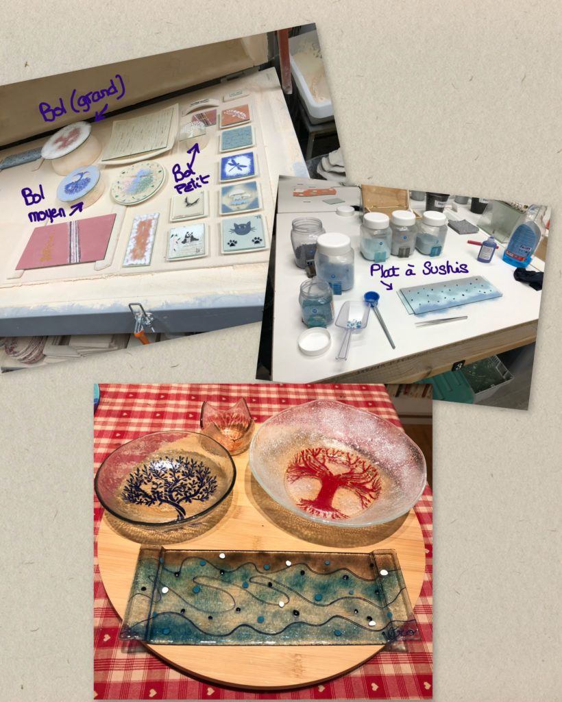 Il faut avoir pas mal d’imagination pour se dire qu’à partir de simples plaques de verre décorées avec de la poudre de verre colorée, on obtiendra, après cuisson, ces beaux objets !